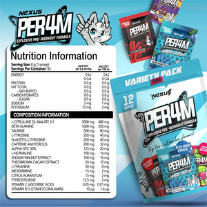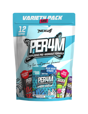 The Nexus PER4M Pre-Workout Variety Pack is the perfect way to experience Nexus’s high-powered, clinically dosed pre-workout formula across a range of bold, best-selling flavours. Each sachet delivers the full PER4M experience—explosive energy, elevated mood, sharper focus and skin-splitting pumps—thanks to 17 carefully selected, performance-driven ingredients.