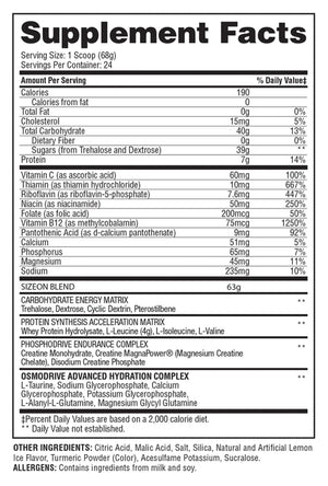 SizeOn contains high-quality whey protein hydrolysate, which is clinically proven to absorb even faster than free-form amino acids. SizeOn also boasts a premium creatine formula, high-performance carbohydrates, a high dose of L-Leucine (4g), and many more anabolic-promoting ingredients.