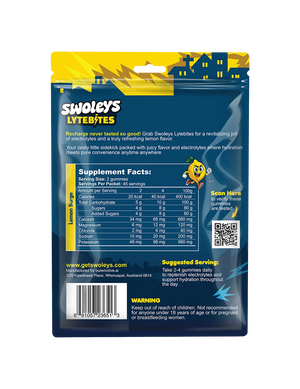 Stay hydrated and refreshed anywhere with Swoleys Lytebites Electrolyte Gummies. Packed with 5 key electrolytes and a zesty lemon punch, these convenient gummies help replenish lost minerals, support hydration, and keep you performing at your best – without the need for a shaker or mixing.