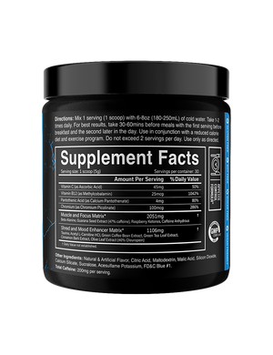 • Muscle & Focus Matrix (2051 mg): Beta-Alanine, Guarana Seed Extract (47% caffeine), Raspberry Ketones, Caffeine Anhydrous (200 mg total caffeine).