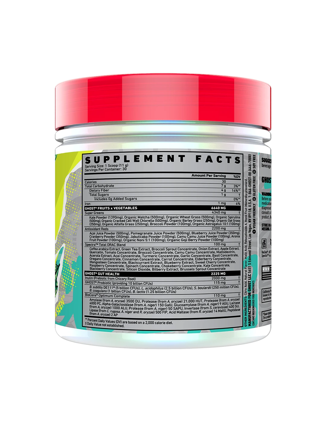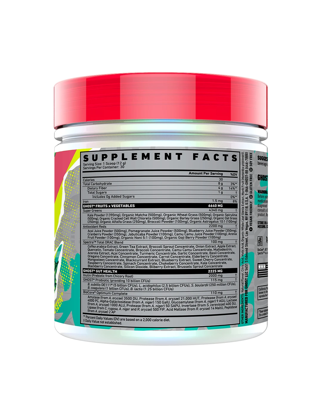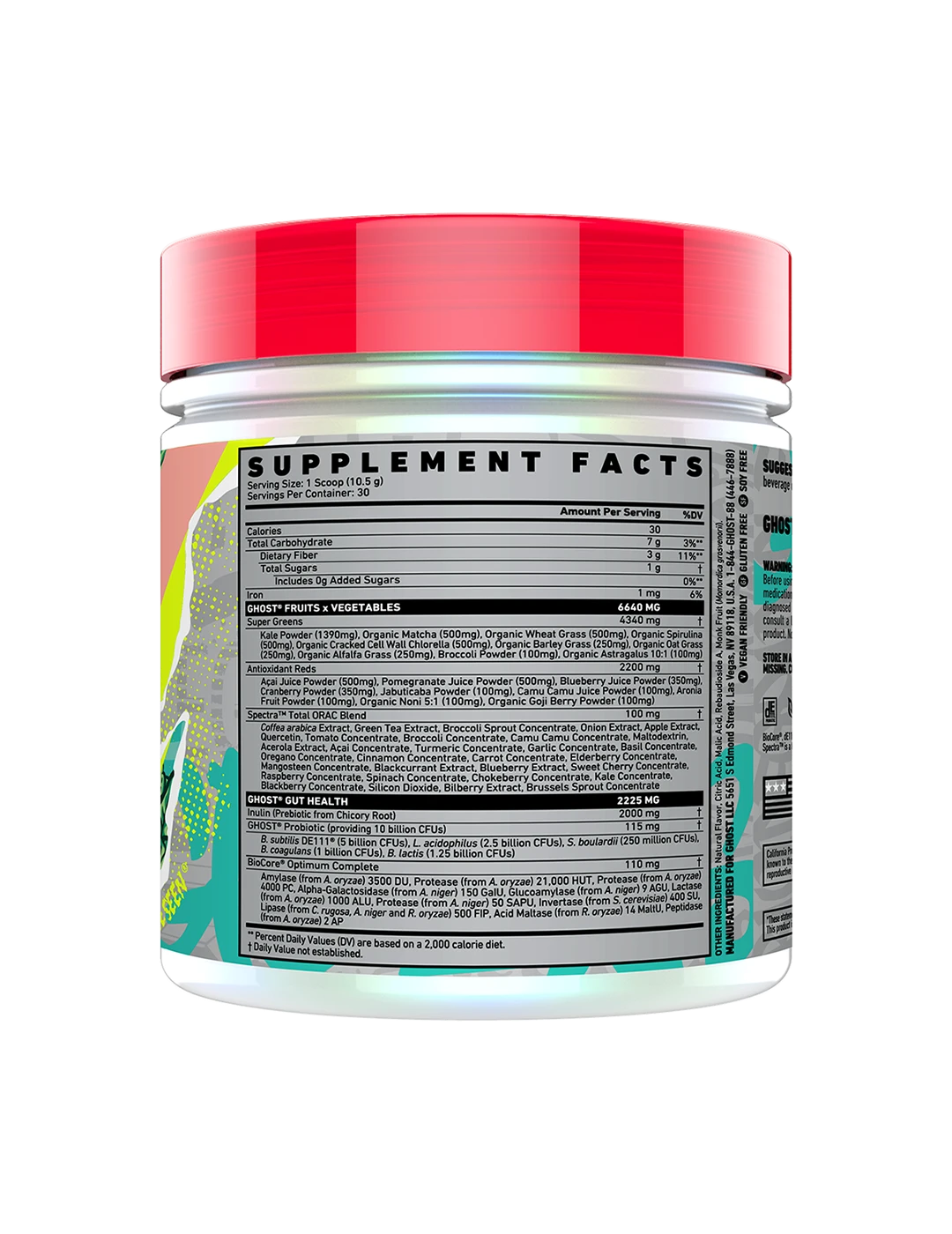 It's now easier than ever to get your fruits and veggies in! Ghost Greens combines 19 individually sourced Greens and Reds with a full 100mg dose of Spectra, Prebiotics, 10 billion CFU probiotics, and the super-premium BioCore Optimum Complete Digestive Enzymes. In true Ghost fashion, Ghost Greens puts other formulas to shame with its delicious taste.