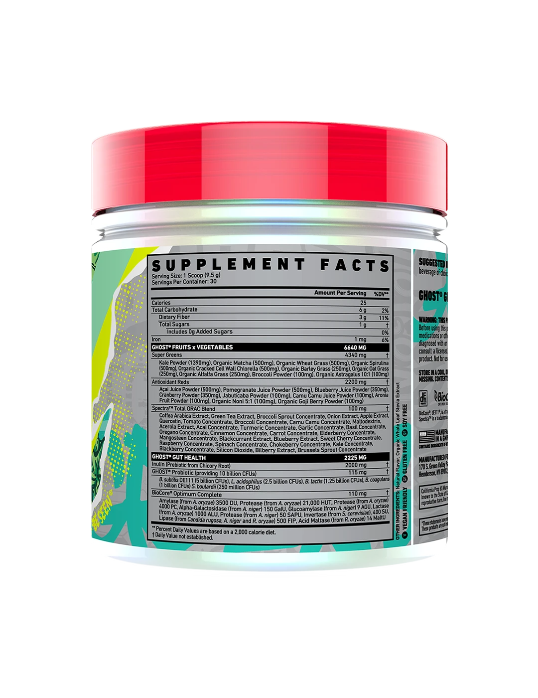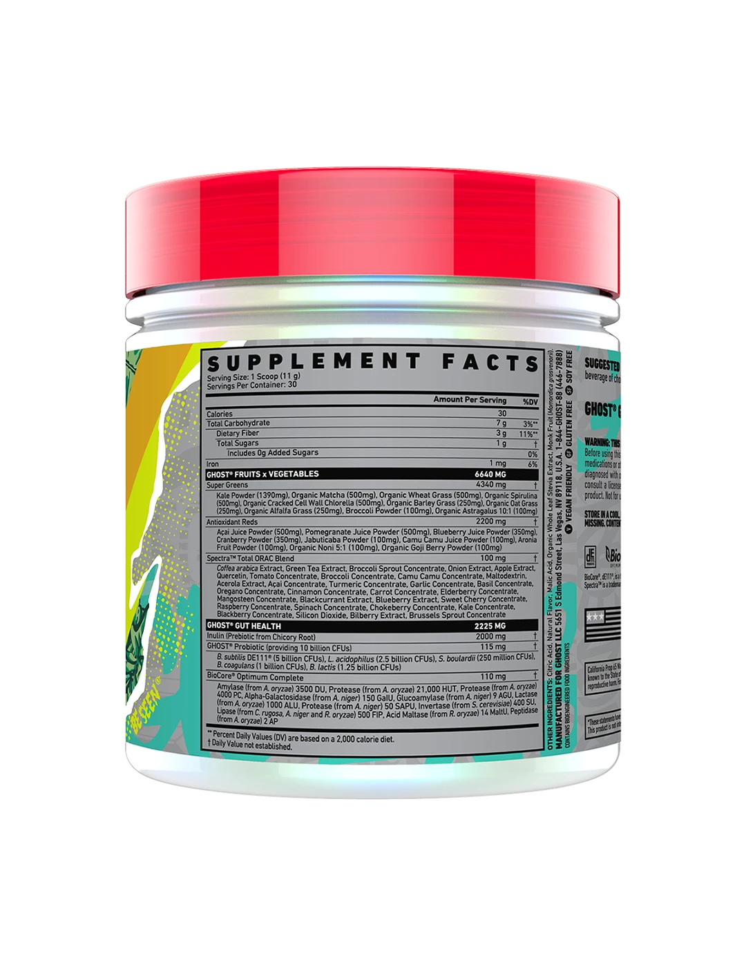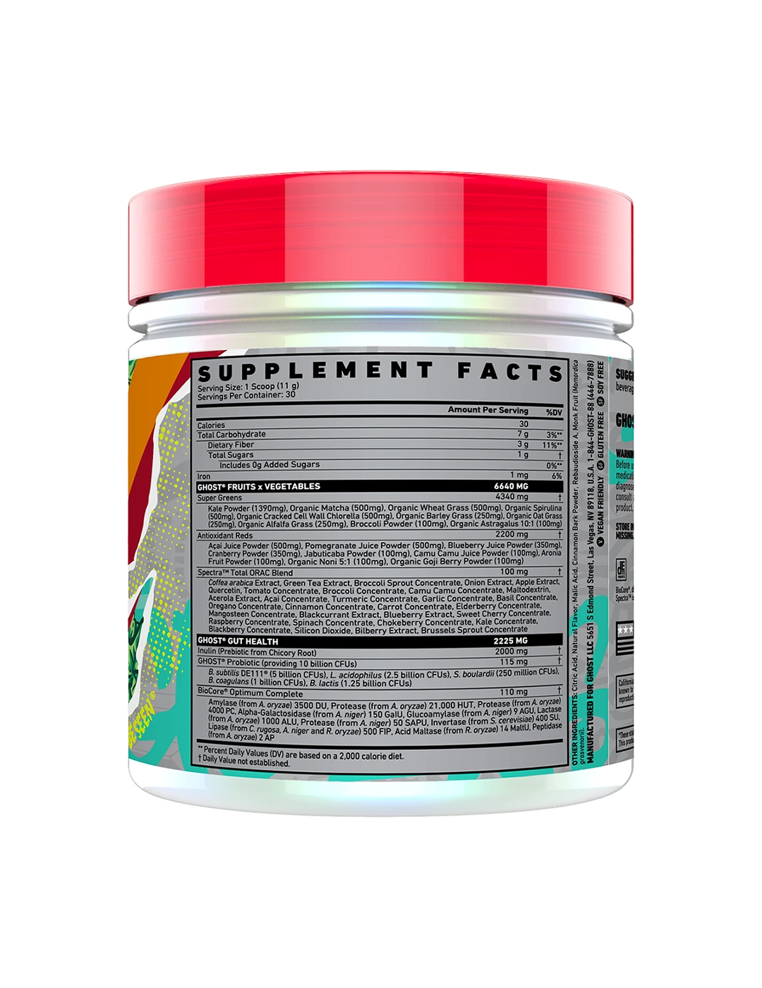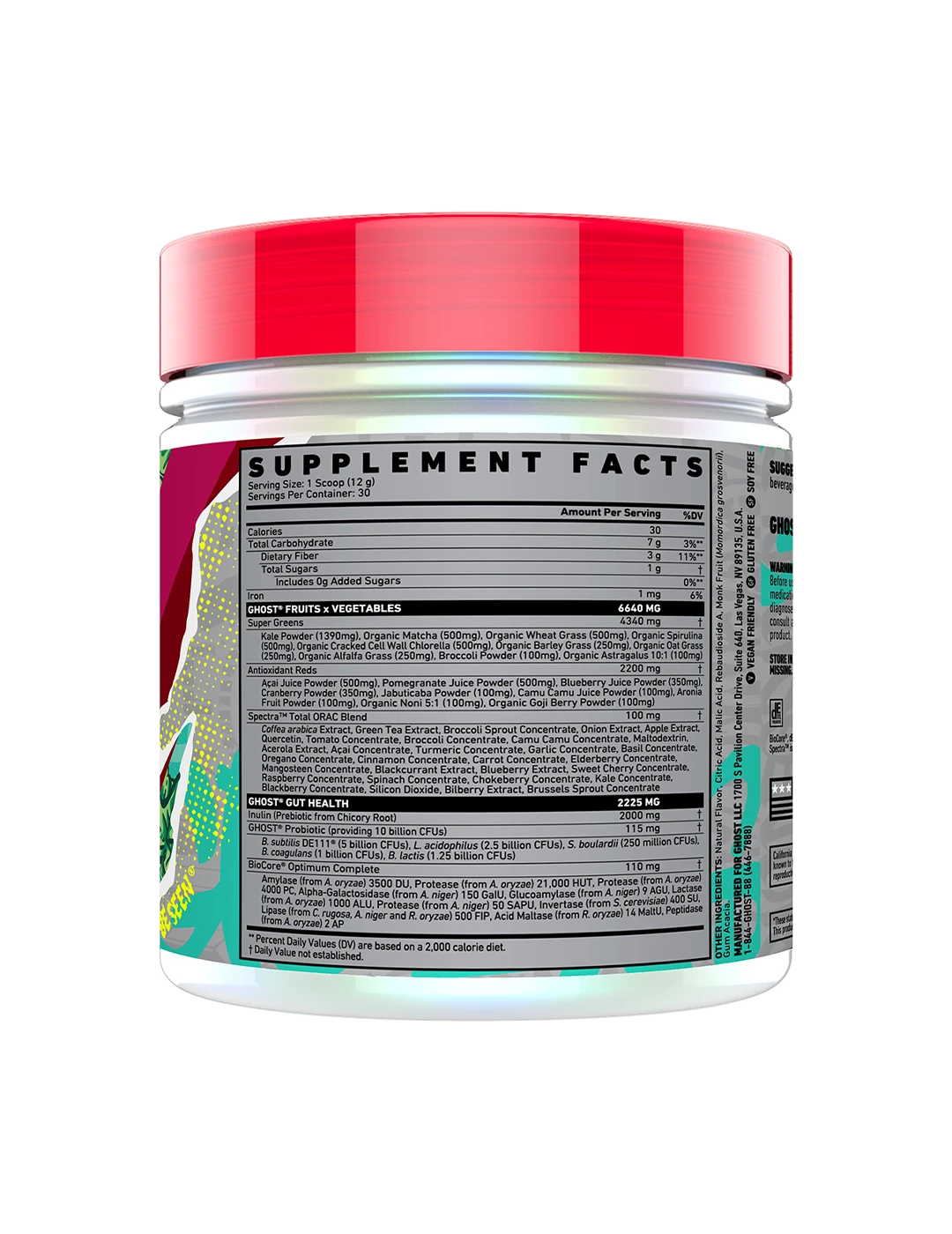 It's now easier than ever to get your fruits and veggies in! Ghost Greens combines 19 individually sourced Greens and Reds with a full 100mg dose of Spectra, Prebiotics, 10 billion CFU probiotics, and the super-premium BioCore Optimum Complete Digestive Enzymes. In true Ghost fashion, Ghost Greens puts other formulas to shame with its delicious taste.