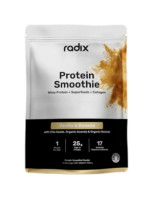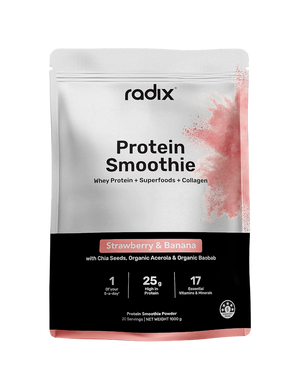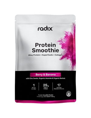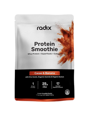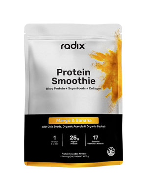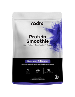Mix one scoop (65g) of Radix Nutrition Whey Protein Smoothies with 200–300ml of cold water, milk, or your preferred beverage. Shake or blend well.