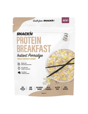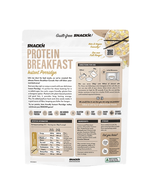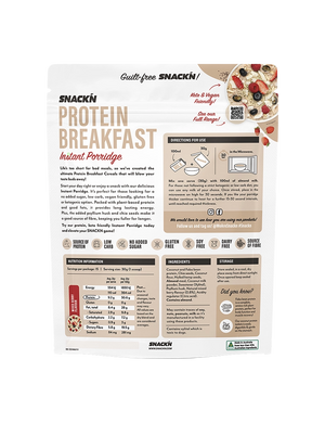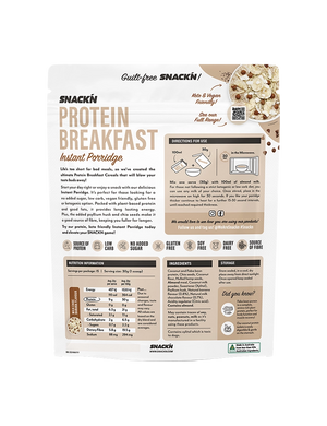Start your day right or enjoy a snack with Snackn Protein Breakfast Instant Porridge. It's perfect for those looking for a no-added-sugar, low-carb, vegan-friendly, gluten-free, or ketogenic option. Packed with plant-based protein and good fats, it provides long-lasting energy. Plus, the added psyllium husk and chia seeds make it a good source of fibre, keeping you fuller for longer.