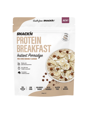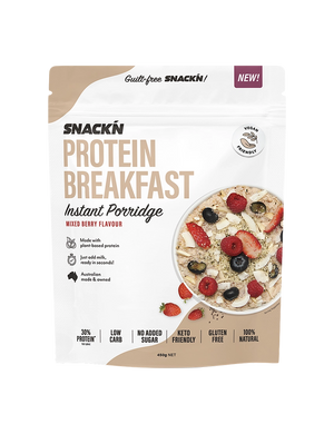 Mix one serve (30g) of Snackn Protein Breakfast Instant Porridge with 100ml of almond milk. For those not following a strict ketogenic or low-carb diet, you can use any milk of your choice. Once stirred place in the microwave on high for 30 seconds. If you like your porridge thicker continue to heat for a further 15-30 second intervals, until reached desired thickness.