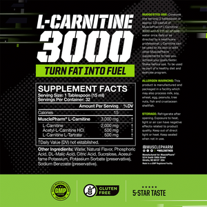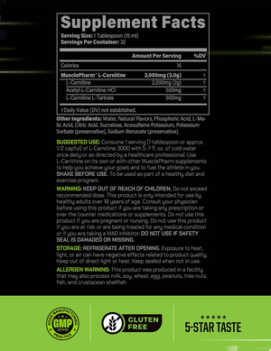 Boost your fitness routine with MusclePharm L-Carnitine 3000, a premium stimulant-free liquid supplement for men and women. Featuring 2000mg of L-Carnitine, 500mg of Acetyl L-Carnitine, and 500mg of L-Carnitine Tartrate per serving, this formula enhances energy production, supports metabolism, and aids mitochondrial function –without caffeine or other stimulants.