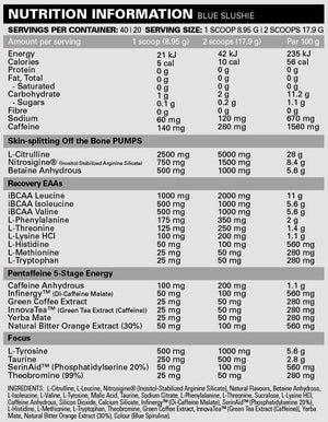 L-Citrulline boosts blood flow and arginine levels, leading to increased vascularity and enhanced aerobic and anaerobic exercise performance. Its supplementation helps improve VO2 kinetics, thus reducing fatigue-induced by-products during exercise. Nitrosigine®, a patented ingredient, promotes nitric oxide production for improved blood flow, focus, and energy, enhancing workout performance and reducing muscle fatigue. Additionally, it helps manage blood pressure levels and increases serum arginine levels, essential for protein synthesis, immune function, and other metabolic pathways. Betaine Anhydrous complements these ingredients by improving body composition, arm size, and workout capacity, due to its role in carnitine production.