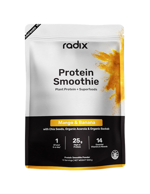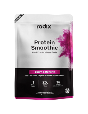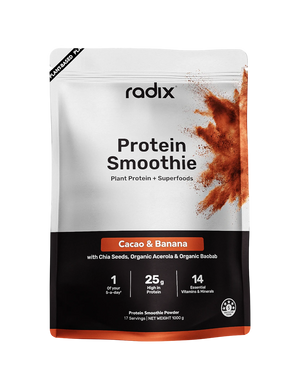 Mix one scoop (64g) of Radix Nutrition Plant Protein Smoothie with 200–300ml of cold water, plant milk, or your preferred beverage. Shake or blend well.