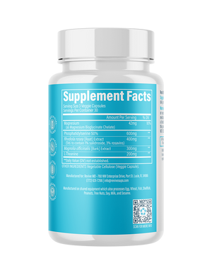 It combines key ingredients like Magnesium Bisglycinate Chelate for optimal absorption and muscle relaxation, Phosphatidylserine for cognitive health, Rhodiola Rosea Extract for stress response and natural energy, Magnolia Officinalis for its calming properties, and L-Theanine for enhanced focus and relaxation.