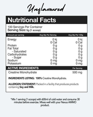 • Nexus Creatine Monohydrate (100 Serves) – Pure creatine to support strength, power, and performance