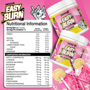 Nexus EasyBurn is a clean metabolic support formula designed to boost energy, support focus, and assist fat-loss efforts. With zero sugar and minimal calories, it’s ideal before training or as an anytime energy lift.