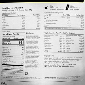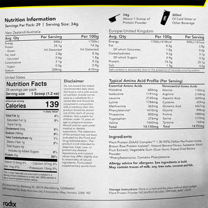 Mix one scoop (34g) of Radix Nutrition Natural Plant Protein with 200-300ml cold water, milk, or beverage of your choice, and mix well. For best results, consume within 30 minutes of your workout, or have it as an anytime snack in your balanced, high-protein diet. Store in a cool, dry place after use.