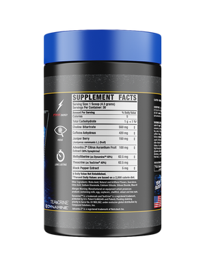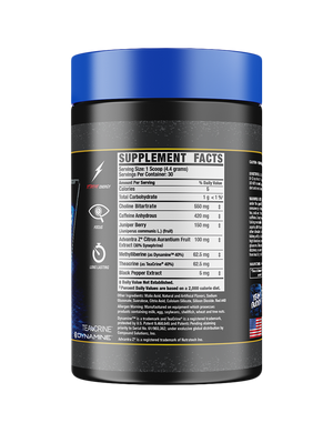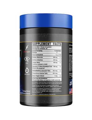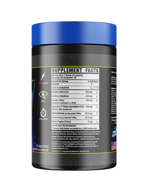 With a potent blend of 420mg Caffeine Anhydrous, 150mg Juniper Berry, 62.5mg Dynamine®, 62.5mg TeaCrine®, and Black Pepper Extract, you’ll enjoy a smooth, clean boost of energy, enhanced mental clarity, and lasting endurance—without the dreaded crash.